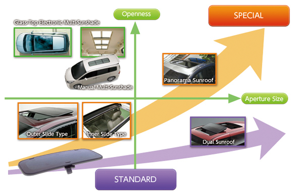 This is the sunroof opened by sliding the glass panel above the automotive roof when opening. This type of sunroof can be mounted on vehicles having a small roof surface, and is also compatible to the dual sunroof mounted vehicles of minivan type.