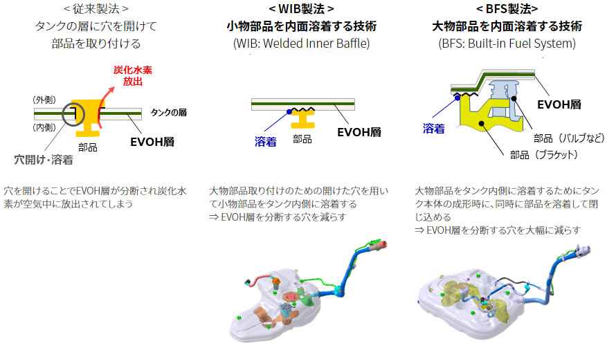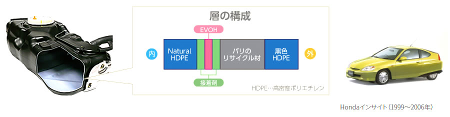 このEVOH層は、ガソリン中の有害成分である炭化水素がタンク層を透過し空気中に放出されることを防いでいます。