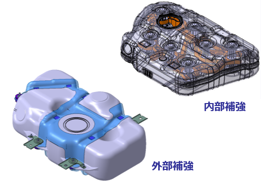 従来より高い剛性をもつ樹脂材料を適用することで、タンク本体の剛性、耐圧性、耐衝撃性を保ちつつ可能な限りの薄肉化を図っています。