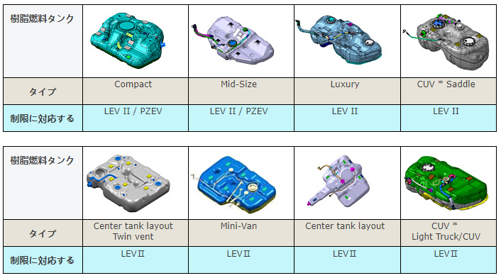 樹脂ならではの形状自由度を活かし、必要な燃料容量を確保しながら、広い車内空間の実現やクルマの重量バランス向上などに寄与しています。