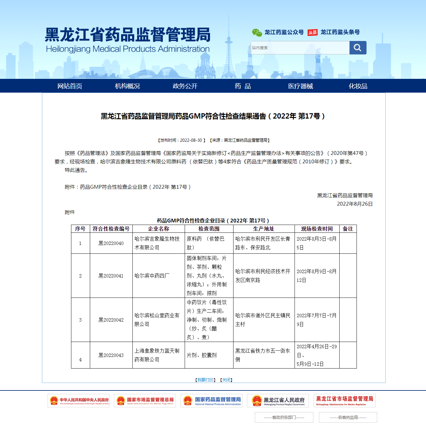8月30日,黑龙江省药品监督管理局网站上公布了本司“依替巴肽”原料药GMP符合性检查结果通告,结果为通过GMP符合性检查。